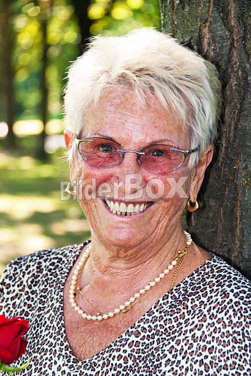 Beschreibung Fröhliche ältere Seniorin mit einer roten Rose.