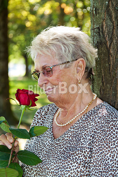 Beschreibung Fröhliche ältere Seniorin mit einer roten Rose.