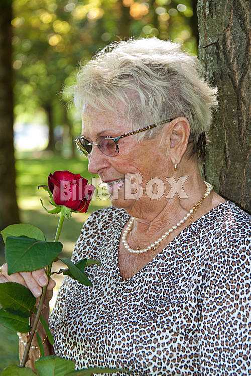 Ältere Frau (Seniorin) riecht an einer roten Rose