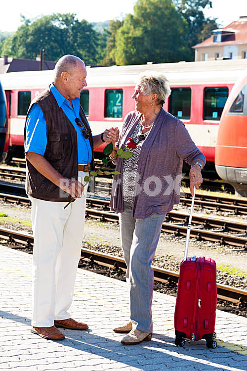 Beschreibung Älteres vitales Senioren Paar am Bahnhof. Reisen in den Urlaub