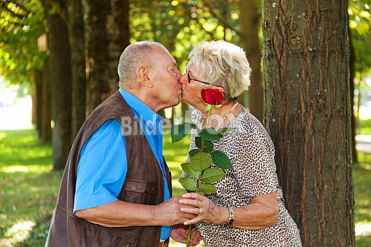 Beschreibung Älteres Senioren Ehepaar ist verliebt. Mann überreicht eine Rose.