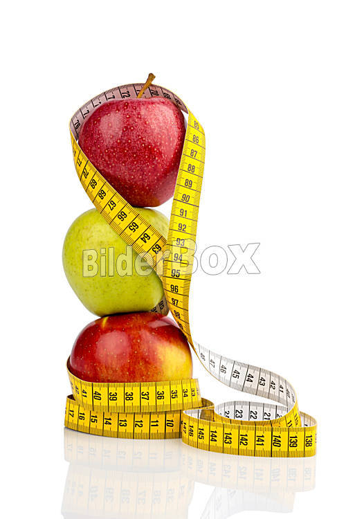 Beschreibung Mehrere Äpfel mit einem Maßband. Symbolfoto für Diät und gesunde, vitaminreiche Ernährung.