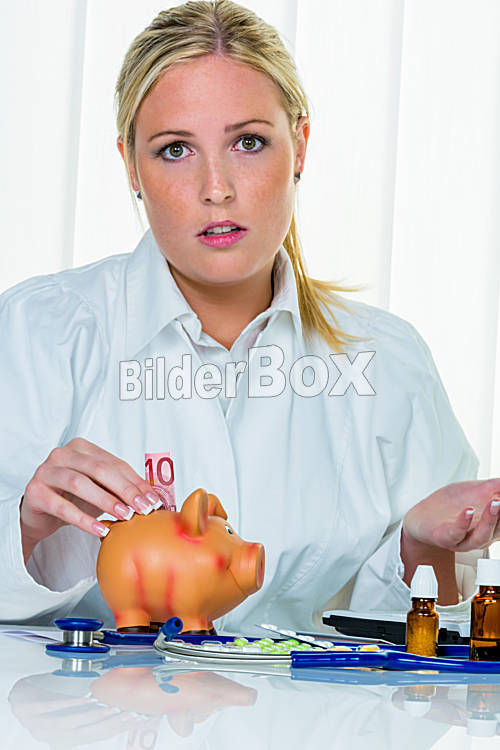 Beschreibung Eine junge Ärztin bei der Ordination in ihrer Arztpraxis.
