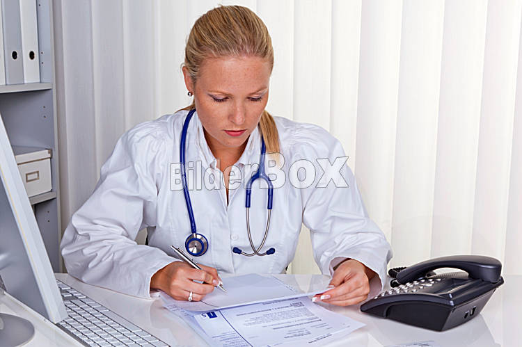 Beschreibung Eine junge Ärztin mit Stethoskop in ihrer Arztpraxis.
