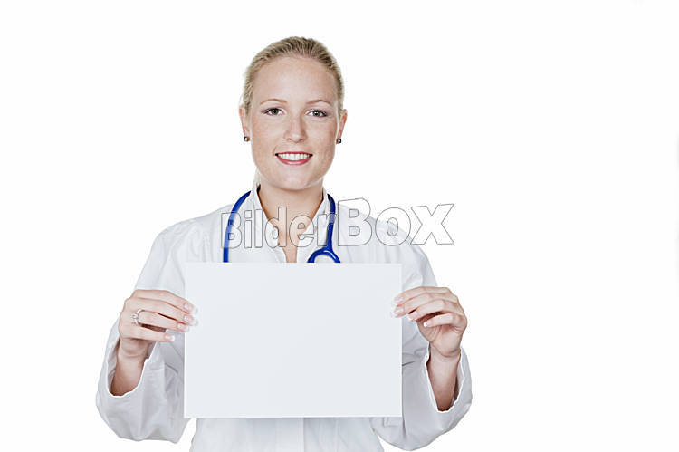 Beschreibung Eine junge Ärztin mit Stethoskop in ihrer Arztpraxis. Hält ein leeres Schild in der Hand