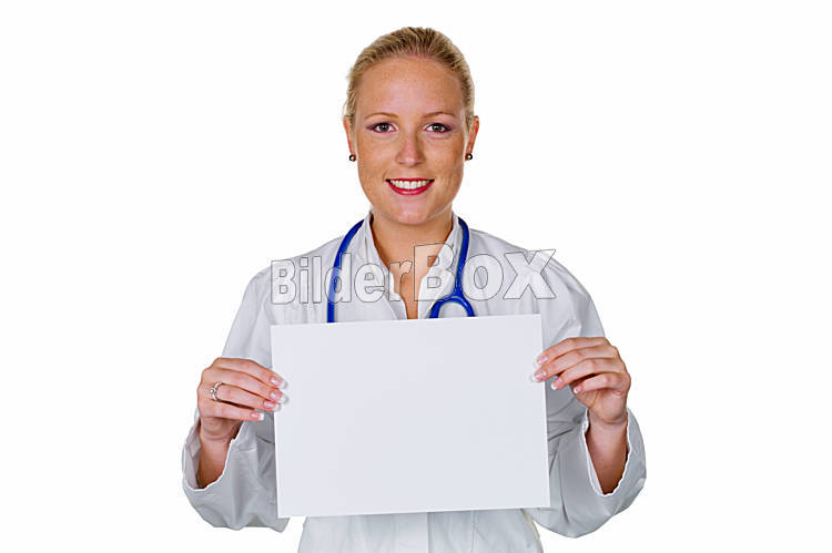Beschreibung Eine junge Ärztin mit Stethoskop in ihrer Arztpraxis. Hält ein leeres Schild in der Hand