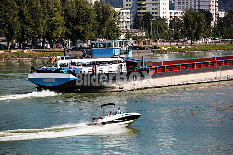 Beschreibung Die Haupstadt von Oberösterreich in Österreich ist Linz. Frachtschiff und Motorboot nebeneinander