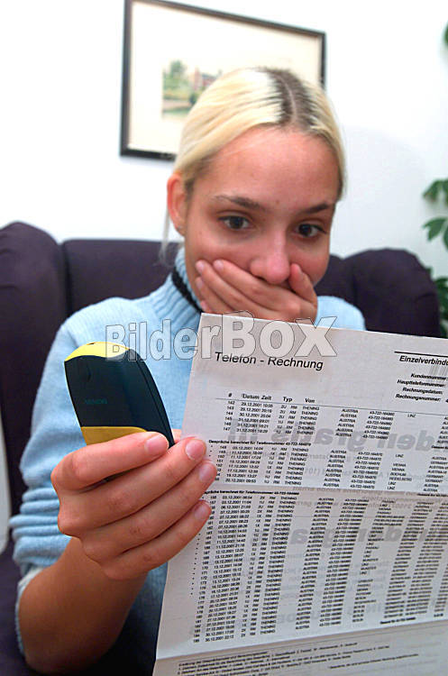 Beschreibung Junge Frau erschrickt ueber hohe Telefon- Handyrechnung Copyright (2002) by BilderBox.com, Erwin Wodicka, A-4062 Thening. Verwendung nur nach unseren AGB: www.bilderbox.com/agb.html ( in an einer...