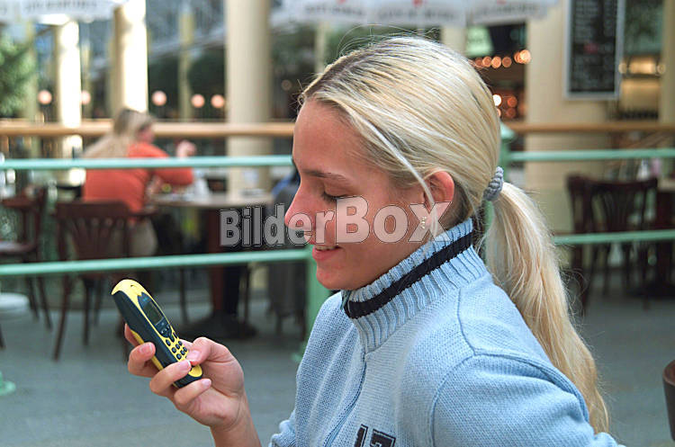 Beschreibung Junges Maedchen SMS schreibend mit Handy Copyright (2002) by BilderBox.com, Erwin Wodicka, A-4062 Thening. Verwendung nur nach unseren AGB: www.bilderbox.com/agb.html ( in an einer einem auf als +...