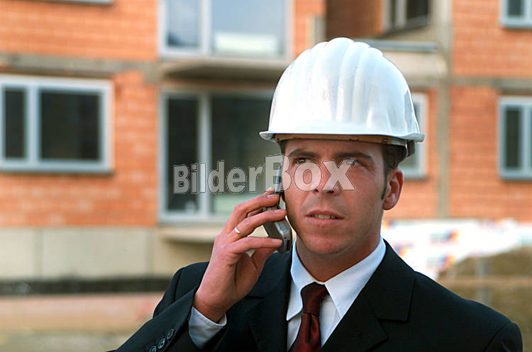 Beschreibung Mann mit Schutzhelm und Handy auf einer Baustelle Copyright (2002) by BilderBox.com, Erwin Wodicka, A-4062 Thening. Verwendung nur nach unseren AGB: www.bilderbox.com/agb.html ( in an einer einem...