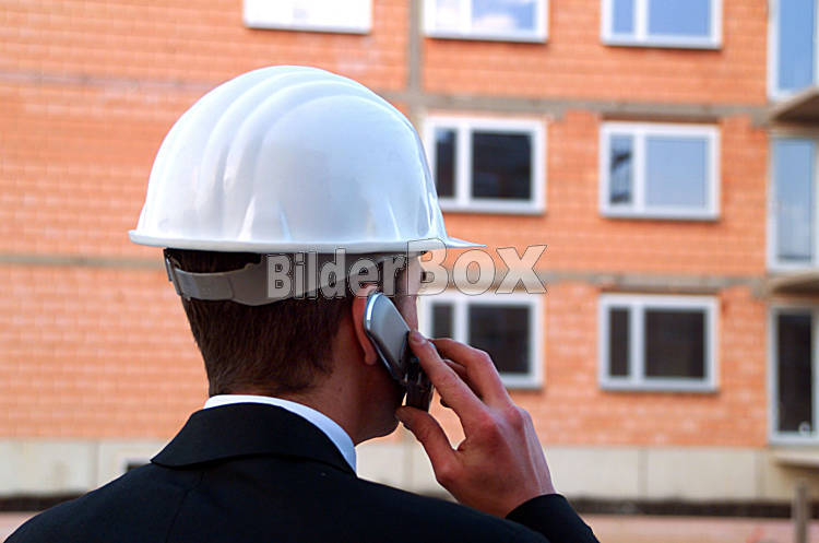 Beschreibung Mann mit Helm (Polier) auf Baustelle und Handy Copyright (2002) by BilderBox.com, Erwin Wodicka, A-4062 Thening. Verwendung nur nach unseren AGB: www.bilderbox.com/agb.html ( in an einer einem auf...