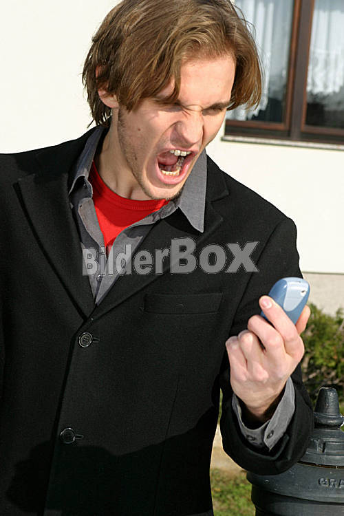 Beschreibung Mann mit Handy aergert sich [ (c) www.BilderBox.com, Erwin Wodicka, A-4063 Breitbrunn, Tel. +43 676 5103 678. Verwendung nur gegen HONORAR, BELEG, URHEBERVERMERK und den AGBŽs auf www.bilderbox.com...
