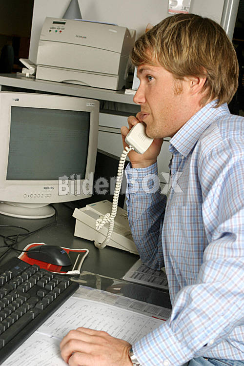 Beschreibung Mann im Buero mit Telefon [ (c) www.BilderBox.com, Erwin Wodicka, A-4063 Breitbrunn, Tel. +43 676 5103 678. Verwendung nur gegen HONORAR, BELEG, URHEBERVERMERK und den AGBs auf www.bilderbox.com ]...