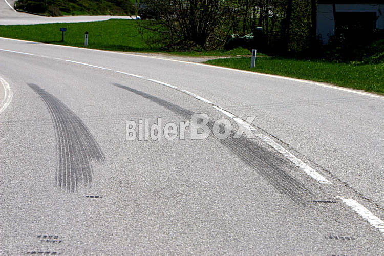 Beschreibung Bremsspur auf einer Strasse [ (c) www.BilderBox.com, Erwin Wodicka, A-4063 Breitbrunn, Tel. + 43 676 5103 678. Verwendung nur gegen HONORAR, BELEG, URHEBERVERMERK und den AGBs auf bilderbox.com ] /...