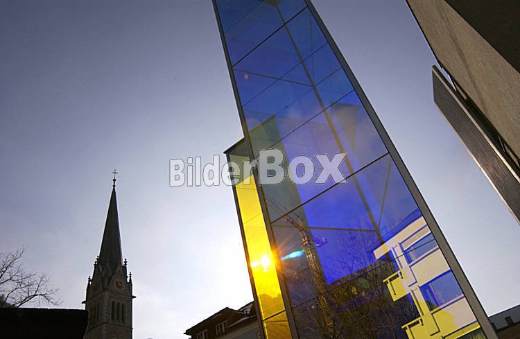Beschreibung Glasturm und Kirche in Vaduz Liechtenstein [ (c) www.BilderBox.com,Erwin Wodicka,Siedlerzeile 3,A4062 Thening,Tel.+43 676 5103 678. Verwendung nur gegen HONORAR, BELEG, URHEBERVERMERK und den AGBs...