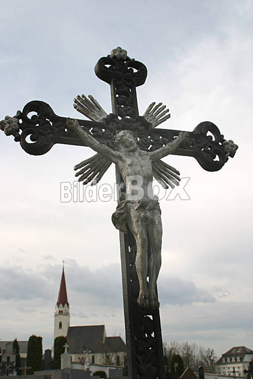 Beschreibung Kreuz mit Kirche im Hintergrund [ (c) www.BilderBox.com,Erwin Wodicka,Siedlerzeile 3,A4062 Thening,Tel.+43 676 5103 678. Verwendung nur gegen HONORAR, BELEG, URHEBERVERMERK und den AGBs auf...