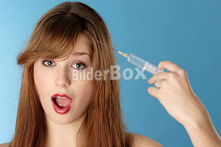 Beschreibung Frau haelt sich eine Medizinspritze an den Kopf [ (c) www.BilderBox.com,Erwin Wodicka,Siedlerzeile 3,A4062 Thening,Tel.+43 676 5103 678. Verwendung nur gegen HONORAR, BELEG, URHEBERVERMERK und den...