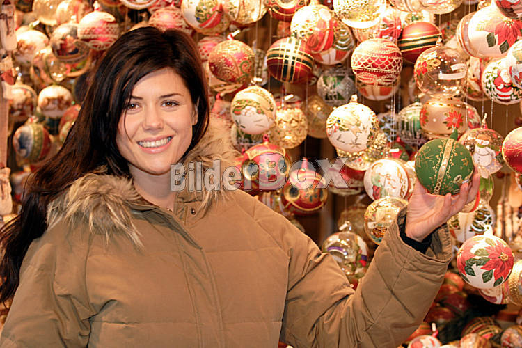 Beschreibung Frau auf einem Weihnachtsmarkt mit Christbaumkugeln [ (c) www.BilderBox.com,Erwin Wodicka,Siedlerzeile 3,A4062 Thening,Tel.+43 676 5103 678. Verwendung nur gegen HONORAR, BELEG, URHEBERVERMERK und...