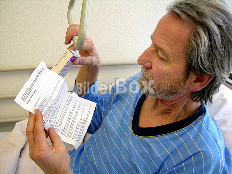 Beschreibung Krankenhauspatient liest Beipacktext eines Medikamentes [ (c) www.BilderBox.com,Erwin Wodicka,Siedlerzeile 3,A4062 Thening,Tel.+43 676 5103 678. Verwendung nur gegen HONORAR, BELEG, URHEBERVERMERK...