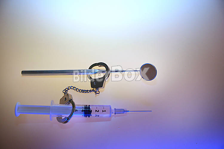 Beschreibung Spritze mit Handschellen / Injection with handcuffs [ (c) www.BilderBox.com, Erwin Wodicka, Siedlerzeile 3, A-4062 Thening, Tel. + 43 676 5103678.Verwendung nur gegen HONORAR, BELEG,URHEBERVERMERK...