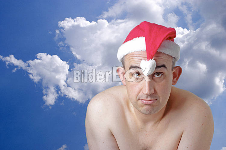 Beschreibung Mann mit Weihnachtsmuetze vor Wolkenhimmel [ (c) www.BilderBox.com, Erwin Wodicka, Siedlerzeile 3, A-4062 Thening, Tel. + 43 676 5103678.Verwendung nur gegen HONORAR, BELEG,URHEBERVERMERK und den...