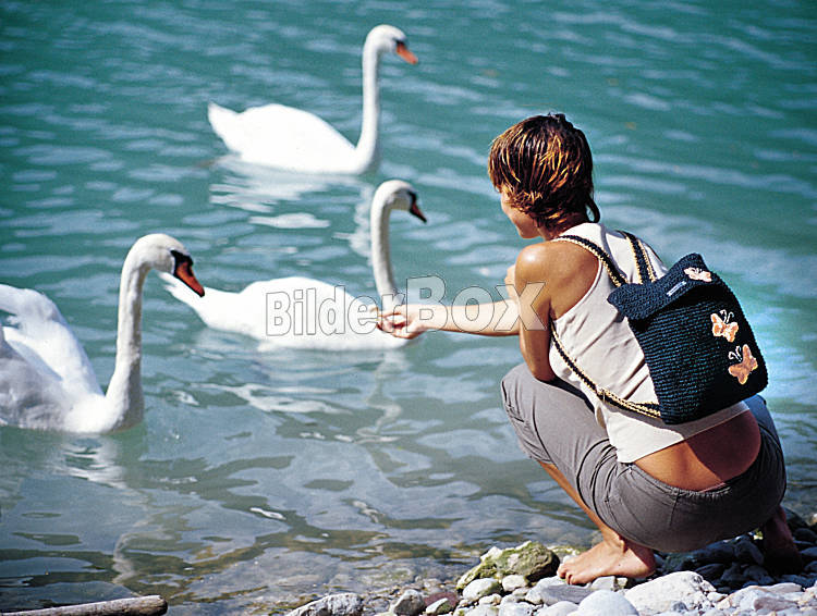 Beschreibung Frau beim Schwaenefuettern [ (c) www.BilderBox.com, Erwin Wodicka, Siedlerzeile 3, A-4062 Thening, Tel. + 43 676 5103678.Verwendung nur gegen HONORAR, BELEG,URHEBERVERMERK und den AGBs auf...