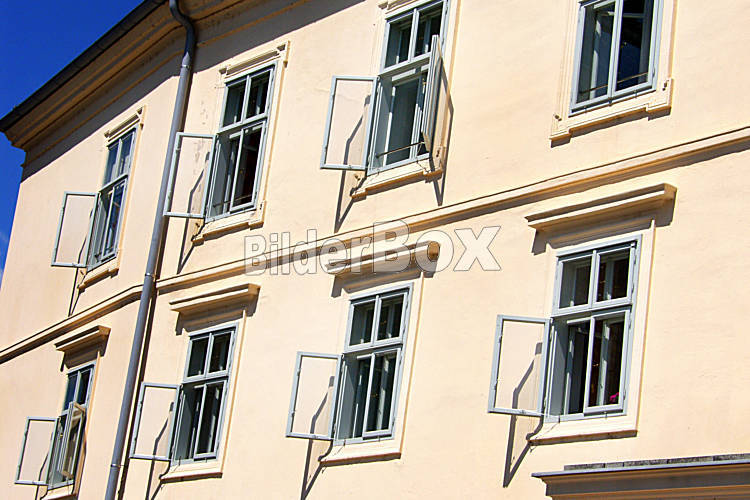 Beschreibung Fensterfront eines Altbaus [ (c) www.BilderBox.com, Erwin Wodicka, Siedlerzeile 3, A-4062 Thening, Tel. + 43 676 5103678.Verwendung nur gegen HONORAR, BELEG,URHEBERVERMERK und den AGBs auf...