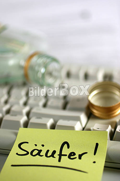 Beschreibung Computertastatur und eine leere Flasche [ (c) www.BilderBox.com, Erwin Wodicka, Siedlerzeile 3, A-4062 Thening, Tel. + 43 676 5103678.Verwendung nur gegen HONORAR, BELEG,URHEBERVERMERK und den AGBs...