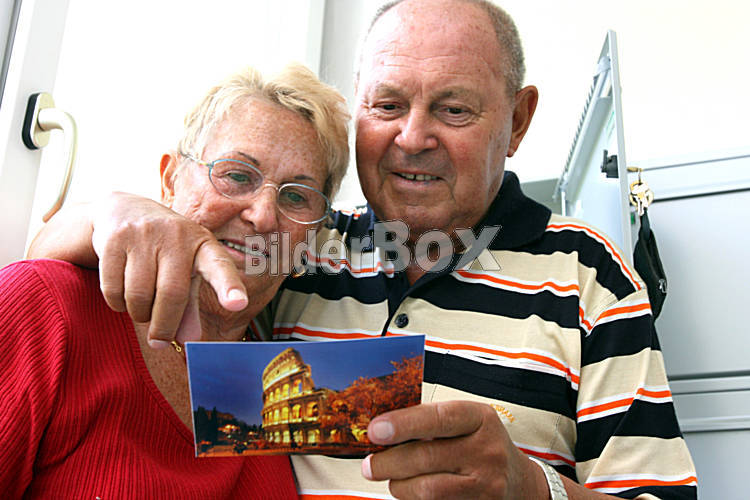 Beschreibung Seniorenpaar freut sich über eine Ansichtskarte [ (c) www.BilderBox.com, Erwin Wodicka, Siedlerzeile 3, A-4062 Thening, Tel. + 43 676 5103678.Verwendung nur gegen HONORAR, BELEG, URHEBERVERMERK...