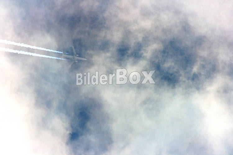 Beschreibung Kondensstreifen am Wolkenhimmel [ (c) www.BilderBox.com, Erwin Wodicka, Siedlerzeile 3, A-4062 Thening, Tel. + 43 676 5103678.Verwendung nur gegen HONORAR, BELEG,URHEBERVERMERK und den AGBs auf...