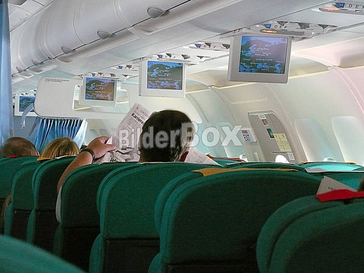 Beschreibung Zeitung lesen im Flugzeug [ NUR FUER REDAKTIONELLE VERWENDUNG! (c) www.BilderBox.com, Erwin Wodicka, Siedlerzeile 3, A-4062 Thening, Tel. + 43 676 5103678.Verwendung nur gegen HONORAR, BELEG,...