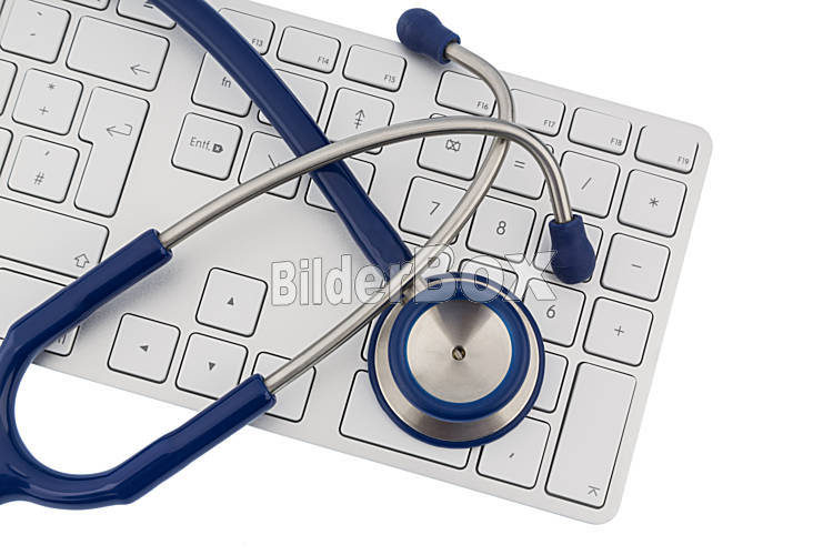 Beschreibung Stethoskop und Tastatur eines Computers, Symbolfoto für Diagnostik und Terminverwaltung