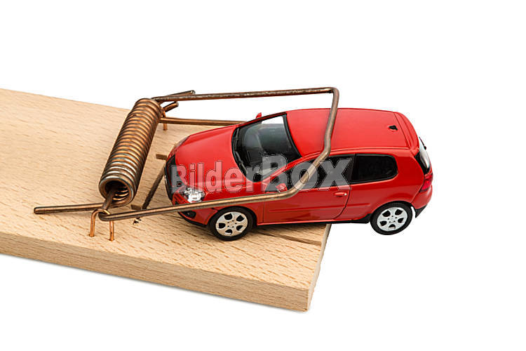 Beschreibung Ein Auto in einer Mausefalle, Symbolfoto für Autokosten und Schulden