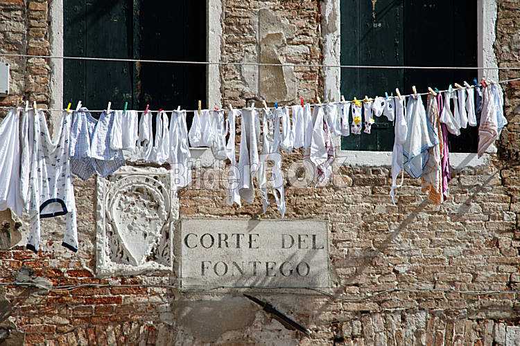 Beschreibung Trocknende Wäsche auf einer Wäscheleine in einem italienischen Hof