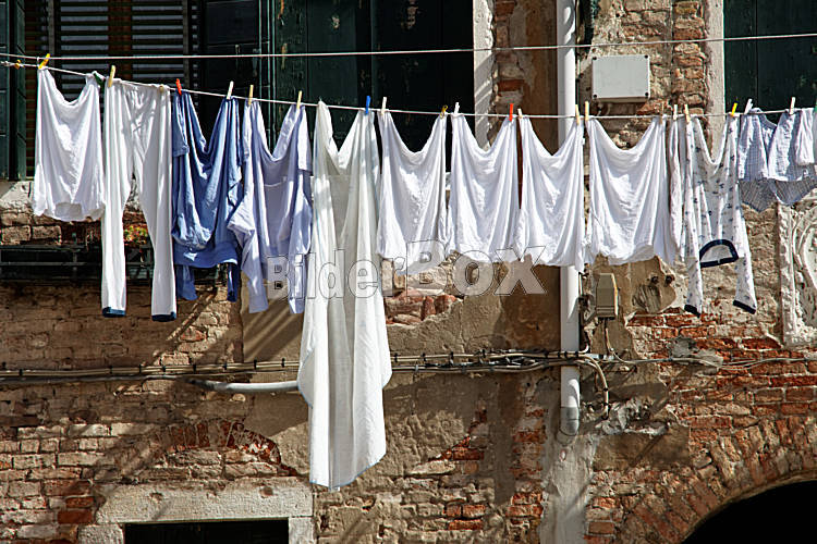 Beschreibung Trocknende Wäsche auf einer Wäscheleine in einem italienischen Hof