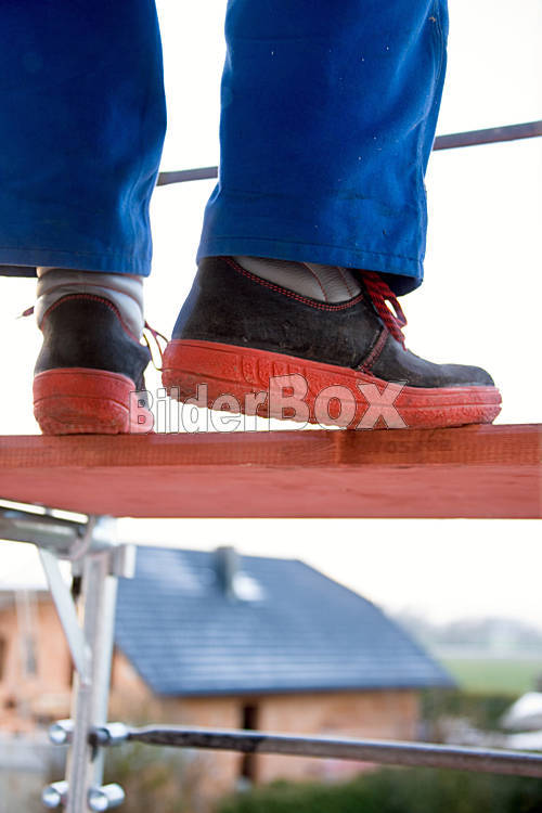 Beschreibung Handwerker im Blaumann balanciert auf einem Baugerüst