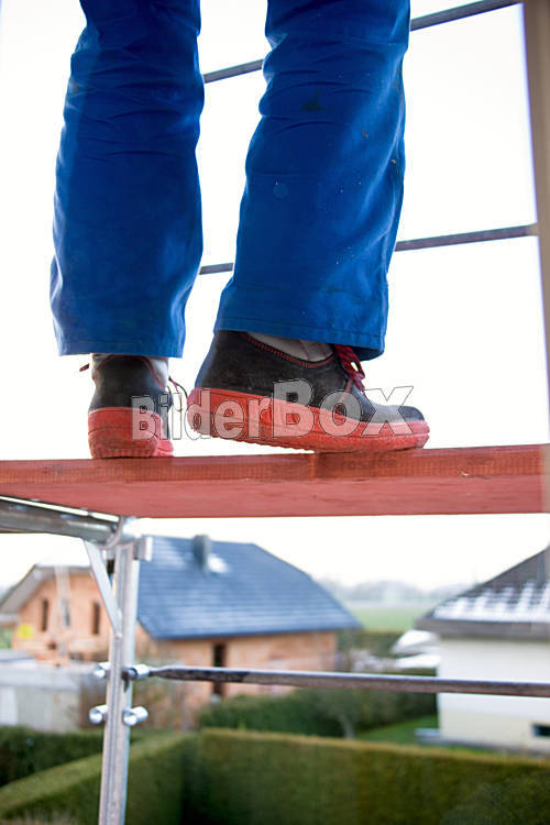 Beschreibung Handwerker im Blaumann balanciert auf einem Baugerüst