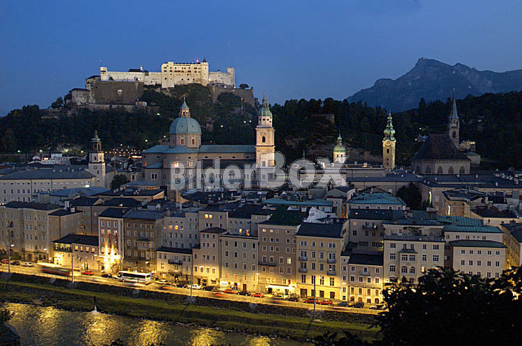 Beschreibung Oesterreich, Salzburg, Festung Hohensalzburg mit dem Salzburger Dom, der Altstadt Nachtaufnahme Copyright (2002) by BilderBox.com; Erwin Wodicka, A-4062 Breitbrunn. Tel.: 0043 676 5103 678....