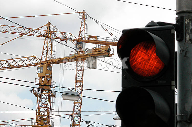 Beschreibung Baustelle mit Baukraenen und Rotlicht Copyright (2002) by BilderBox.com; Erwin Wodicka, A-4062 Breitbrunn. Tel.: 0043 676 5103 678. Veroeffentlichung nur nach unseren AGBs:...