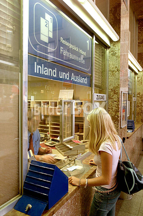 Beschreibung Frau kauft eine Fahrkarte der oesterr. Bundesbahn Copyright (2002) by BilderBox.com; Erwin Wodicka, A-4062 Breitbrunn. Tel.: 0043 676 5103 678. Veroeffentlichung nur nach unseren AGBs:...