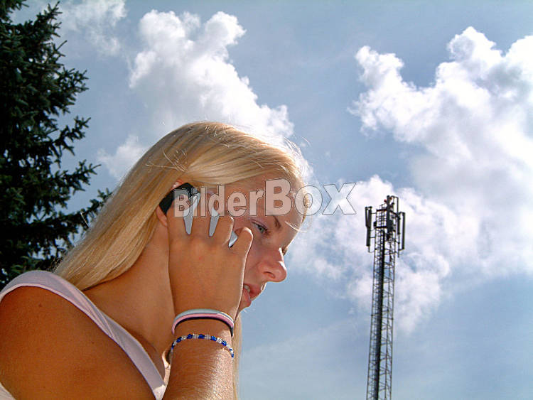Beschreibung Frau mit Handy und Handy-Telefonmasten Copyright (2002) by BilderBox.com; Erwin Wodicka, A-4062 Breitbrunn. Tel.: 0043 676 5103 678. Veroeffentlichung nur nach unseren AGBs:...