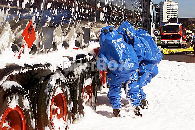 Beschreibung Feuerwehrmaenner beim loeschen eines Gefahrengut Transporters nach einem Unfall mit Vollschutzanzügen Löschzug, Löschender, Loeschzug, Loeschender, Feuerwehreinsatzkräften, .Feuerwehrmann,...