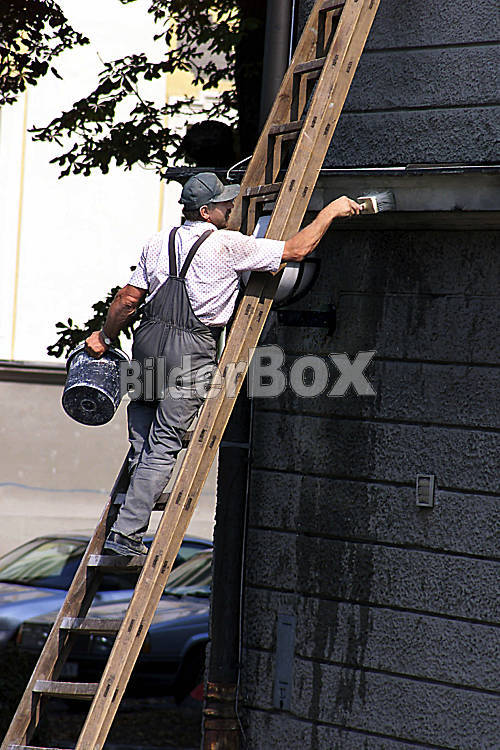 Beschreibung Mann beim streichen eines Hauses Mann,Arbeit,Menschen,Anstreichen,Maler,Leiter, Copyright by BilderBox; Erwin Wodicka; A- 4062 Thening; Jänner 2000