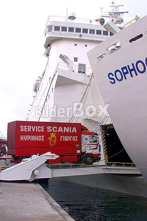 Beschreibung Lastwagen fahren in Faehrschiff...