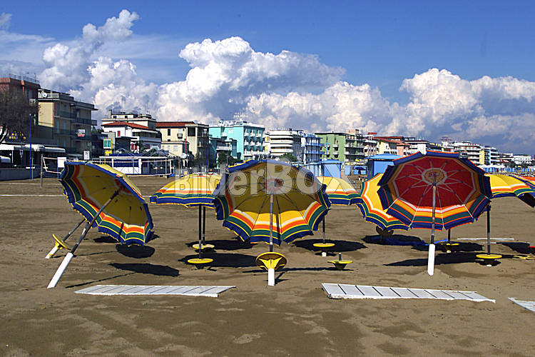 Italien,Grado,Strand,Sonnenschirme,Ferien,Liegestühle,Liegestuehle,Adria,Himmel,Urlaubsende,Saisonende,Wolken