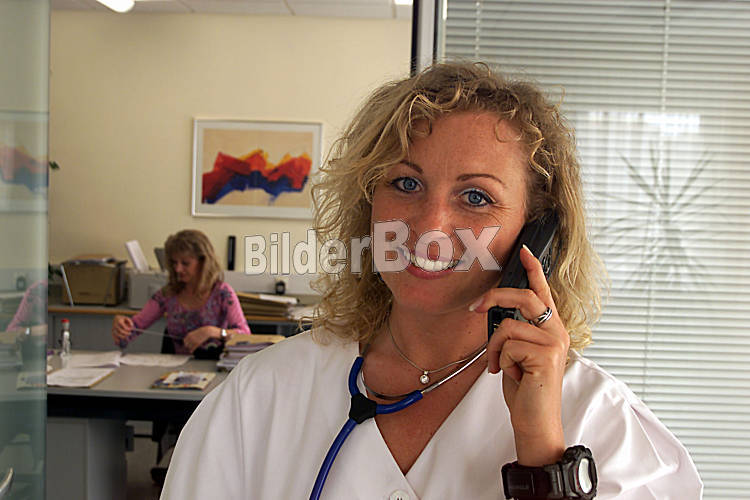 Beschreibung Praktische Aerztin mit Stetoskop und Handy...