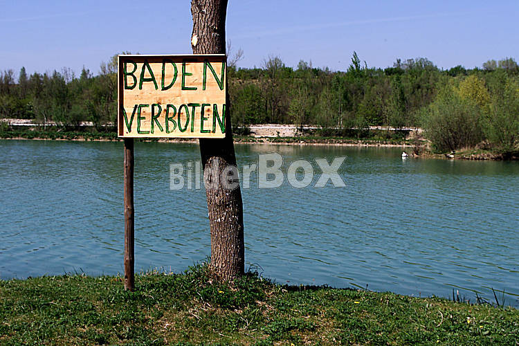 Beschreibung See mit Schild Baden verboten Wasserqualität,Wasserqualitaet,Verboten,Baden,Schwimmen,Wasserverunreinigung,Wasserverschmutzung,Umwelt Copyright (2000) by BilderBox- Erwin Wodicka; A-4062 Thening;...