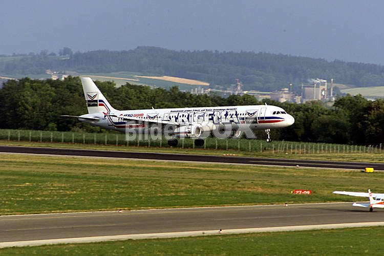 Beschreibung Landendes Flugzeug der Aeroloyd Airlines mit Werbeaufschrift eines deutschen Bekleidungsherstellers Flughafen,Fliegen,Flugzeuglandung,Landen,Gleiten,Schwebendes,Aero Loyd,Fluglinien, Copyright...