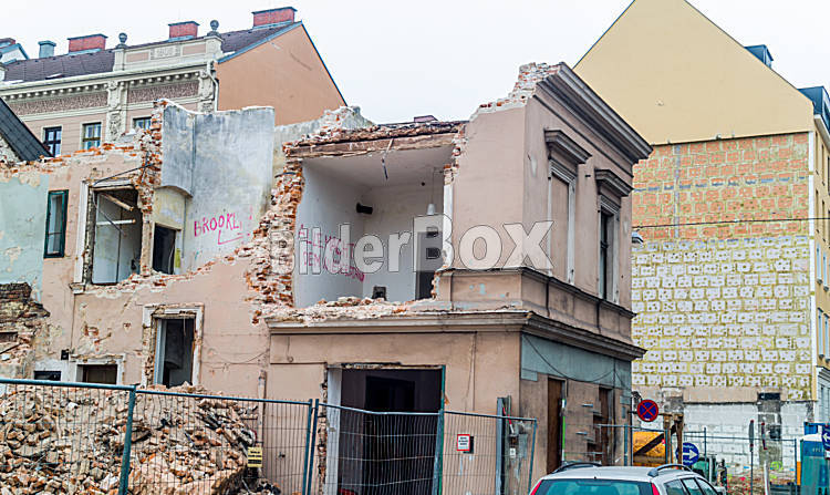 Beschreibung Ein altes Haus wird abgerissen um Platz für den Neubau von Wohnungen zu bekommen. Stadt Erneuerung und Reonovierung
