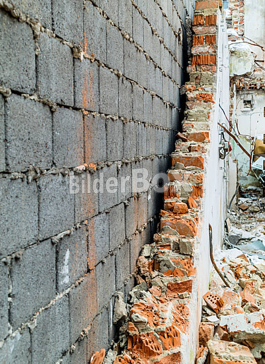 Beschreibung Ein altes Haus wird abgerissen um Platz für den Neubau von Wohnungen zu bekommen. Stadt Erneuerung und Reonovierung